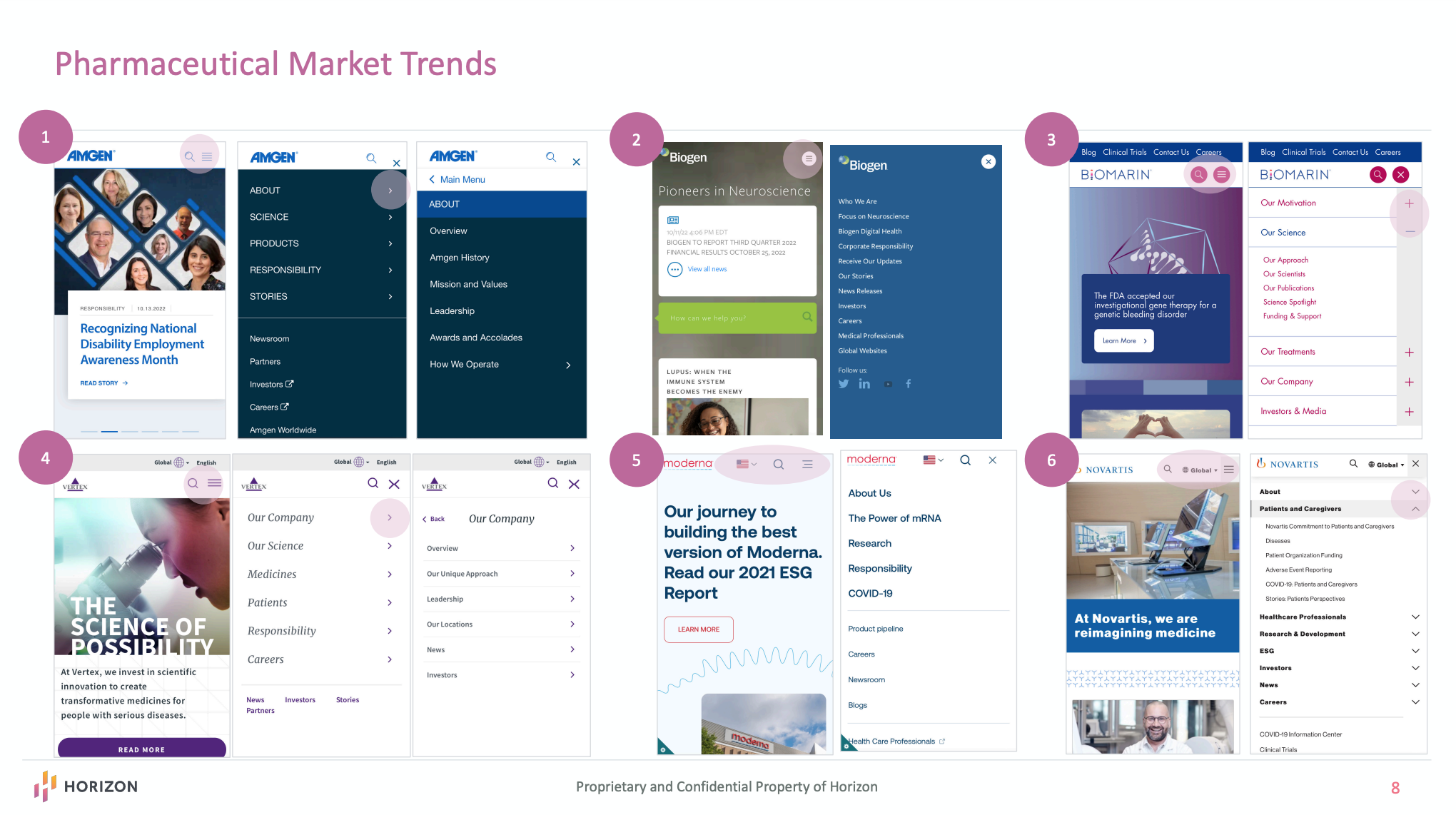 To define an informed strategy, I conducted a competitive audit of 40 websites — 20 pharmaceutical and 20 from adjacent industries (SaaS, finance, and healthcare).