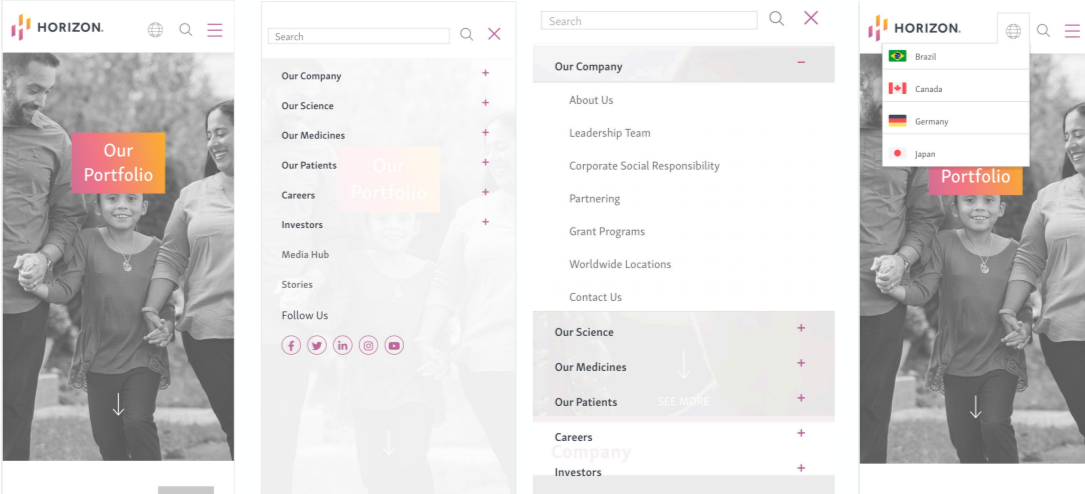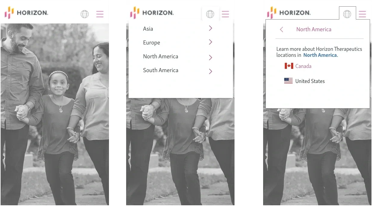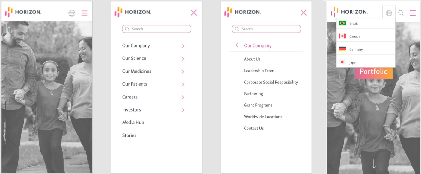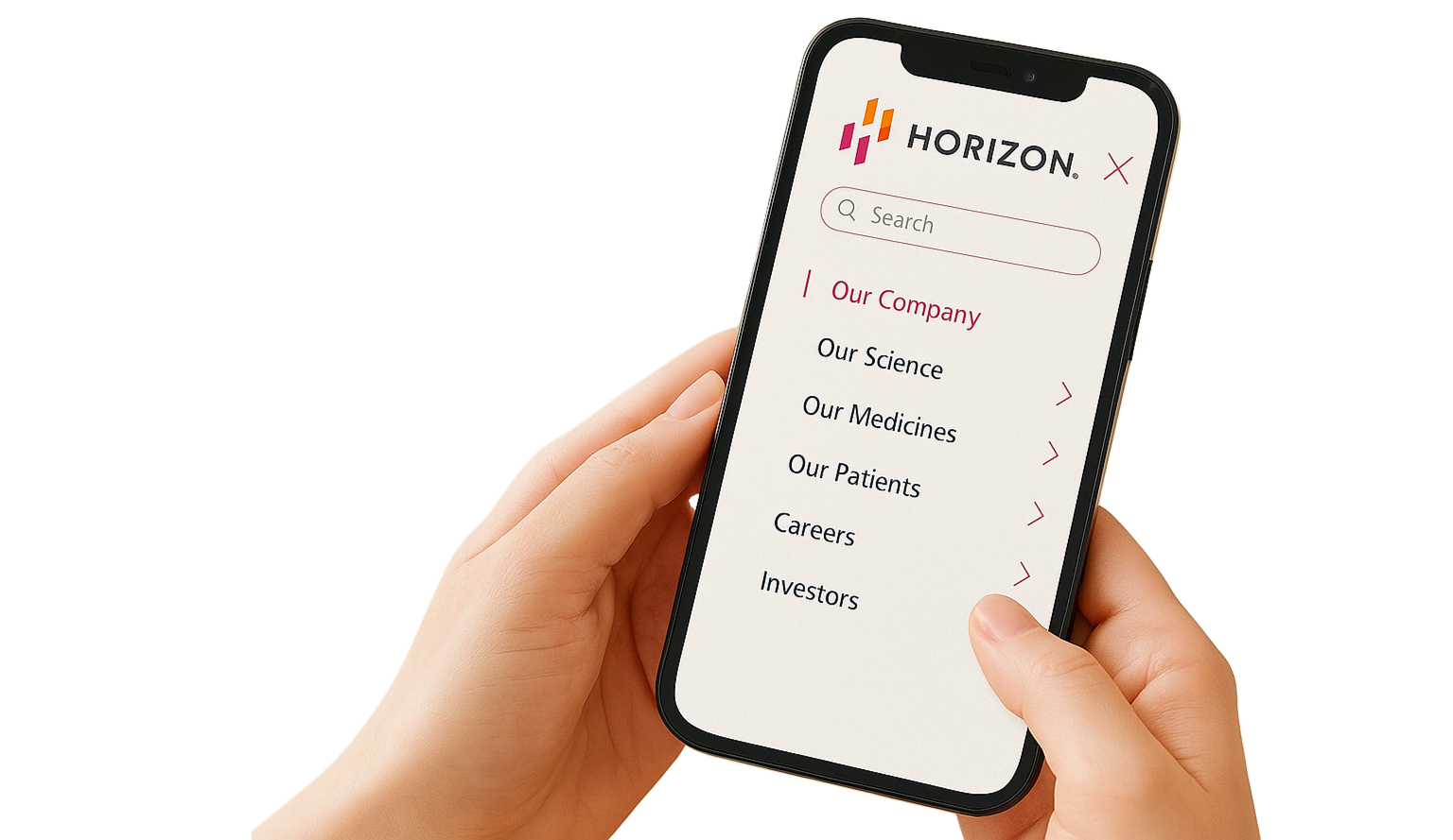 As part of Horizon Therapeutics’ broader UX modernization effort, I led a full research and redesign initiative focused on improving the mobile navigation experience for their corporate site.